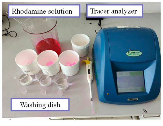 As shown in Figure 15, the “fluorescence tracer technique” was selected for the droplet deposition test, and 0.134 g Rhodamine powder was added to 1 L of distilled water to prepare the Rhodamine solution. The Rhodamine solution was fully mixed with 200 L water in the tank of the sprayer, and the Rhodamine solution was elevated three times. According to the absorbance value of the tracer analyzer, the Rhodamine solution concentration was measured, and the average concentration was found to be 996.34 μg/L. After the spraying test, the sampling filter paper was washed at a constant volume, and the constant volume solution was 50 mL. The concentration of the constant volume solution after washing was measured using a tracer analyzer.
