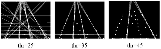 As shown in Figure 17, when the accumulated threshold thr is 25, the candidate crop rows are redundant, and too many lines will increase the weight of the outlier threshold, affecting the accuracy of the guidance line. When the accumulated threshold thr is 45, some candidate crop rows will disappear, affecting the guidance line fitting. When the accumulated threshold thr is 35, the number of extracted crop rows is relatively balanced, demonstrating an ideal fitting effect.