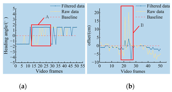 As shown in Figure 18, the original guidance information is frequently impacted by the vibration of the vehicle and the disturbance of leaves, appearing as serious jitter in the video stream. Moreover, in this case, the guidance signal cannot be transmitted to the control system. The Kalman filter data shows that the fluctuation of the heading angle and lateral offset of the guidance line processed by the Kalman filter is significantly suppressed. It can be seen from Figure 18a that the guidance line heading angle data jitter is obviously smoothed by the Kalman filter in section A, and even if the guidance line heading angle jitters frequently, the Kalman filter will make a smooth transition. Comparing Figure 18a,b, the Kalman filtering effect of the guidance lateral offset is better than that of the guidance heading angle. In section B, the abnormal data in the guidance lateral offset are obviously filtered, and the average error between the filtered data and the original data is 2.26 cm, indicating that the Kalman filtering prediction effect is relatively accurate, and the data after Kalman filtering can be sent to the row-oriented spraying system as a control signal.