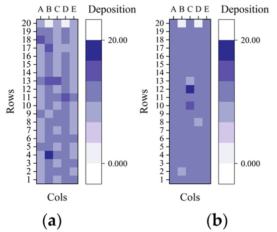 After the droplet deposition was obtained, the droplet deposition per unit area was normalized using the Origin drawing software, and the heatmaps of the row-oriented spraying and full-coverage spraying were drawn. Figure 20a shows that there was a significant difference in the color depth of droplet deposition between rows and between plants, but the inter-row color depth with row-oriented spraying was very close to the full-coverage spraying interrow color depth in Figure 20b, indicating that the deposition between them is also close. The two pictures show that the uniformity of the full-coverage spraying is better than that of the row-oriented spraying. In addition, the uniformity of the row-oriented spraying in the row is better than that between plant depositions. From the color change of heatmap 20(a), it can be inferred that the droplet deposition of the row-oriented spraying is mainly distributed on plants.