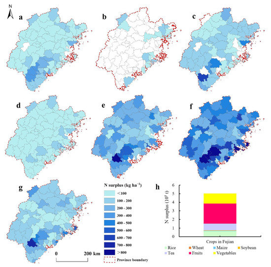 3.3. Analysis of N Surplus in Multiple Crops at the County Scale in Fujian Province