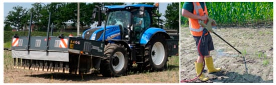 Schreier et al. [21] performed some field experiments in soybean (Glycine max (L.) Merr.) and concluded that electrocution could be part of an integrated weed management system, because it can eliminate late-season herbicide-resistant weeds. Moreover, they concluded that the effectiveness of electrocution (evaluated by visual control ratings 3 or 42 days after treatment) on some annual weed species (Amaranthus tuberculatus (Moq.) Sauer [waterhemp], Xanthium strumarium L. [cocklebur], Ambrosia trifida L. and Ambrosia artemisiifolia L. [giant and common ragweed], Conyza canadensis (L.) Cronquist [horseweed], Setaria faberi Herm. and Setaria pumila (Poir.) [giant and yellow foxtail], and Echinochloa crus-galli (L.) P. Beauv. [barnyardgrass]) is most strongly correlated to plant height and plant moisture content at the time of electrocution. The Pearson correlation coefficient between weed control (42 days after treatment) and plant height or plant moisture content was, respectively, −0.54 and −0.26. Two electrocution passes led to a better control compared to one pass. This last result is confirmed in earlier research by Diprose et al. [22] on the control of sugar beet (Beta vulgaris L.) bolters. According to the French Wine Institute [23], electrocution speed, which determines the contact time between electrode and plant leaves, had a significant effect on the effectiveness of electrocution for all weed species (mainly grasses) included in its study. Efficacy significantly improved by reducing speed from 3.5 km·h−1 to 2.5 km·h−1. According to Vigneault and Benoît [14], soil moisture content negatively affects the effectiveness of the electrocution technique. In dry soils, more current flows through the belowground plant parts (and not through the soil volume), which leads to an increased damage to the plant root system.
