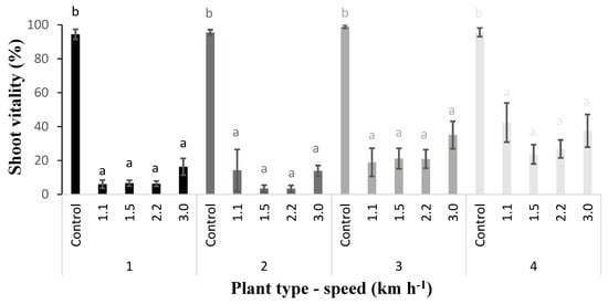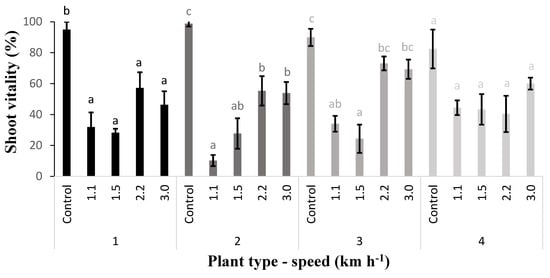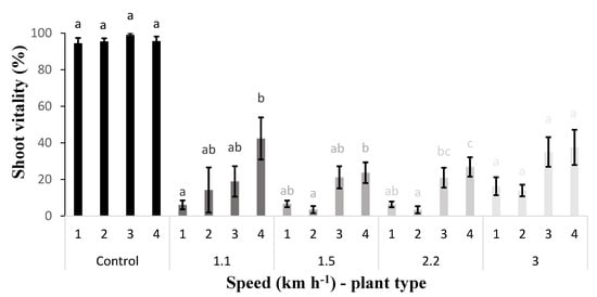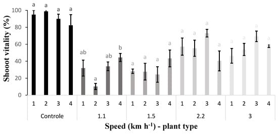 Shoot vitality (%) of electrocuted C. esculentus plants for each combination of speed (km·h−1) and plant type in the Zasso experiment at Bocholt in 2021. Means sharing the same letter are not significantly different (p < 0.05); comparison within speed only.