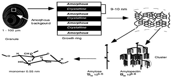 Schematic representation of different structural levels of the starch granule and the involvement of amylose and amylopectin in developing starch molecules [64].