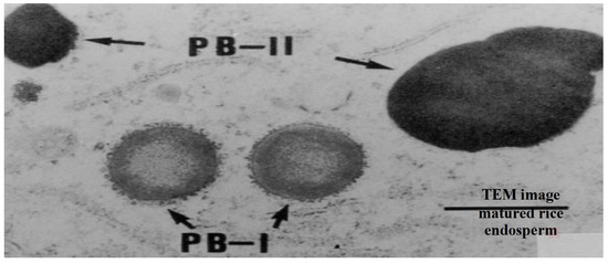 Transmission electron microscope (TEM) image of ‘Protein body I (PB-I; where prolamins accumulate within the smooth endoplasmic reticulum)’ and Protein body-II (PB-II, where globulins and glutelins are accumulated into protein storage vacuoles)’ in matured rice endosperm. Source [75].