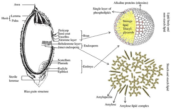 Freshly harvested rice (Oryza sativa L.) grains, known as “paddy” or “rough” rice, are usually milled before human consumption. Paddy typically comprises 20% husk, 11% bran (aleurone layer) and 69% starchy endosperm [1,2,3]. Milling involves de-hulling the paddy and polishing, where the bran layer and part of the embryo are removed from brown rice to produce broken and un-broken (whole grain) starchy endosperm kernels, known as polished rice [1]. Polishing is important because brown rice, produced after the removal of the indigestible husk tissue, contains lipids and fatty acids in the bran layer, which is problematic for long-term grain storage. They hydrolyze and oxidize to form aldehydes and ketones, making the rice grain rancid over long-term storage periods [4,5].
