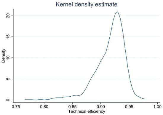 The descriptive statistics of variables in the production function (see Table S2) can be found in the Supplementary Materials. The results of the estimated production function (see Tables S4 and S5) are presented in the Supplementary Materials. The kernel density distributions of the technical and environmental efficiency scores are shown in Figure 1 and Figure 2, respectively. As shown in Table 1, the technical efficiency scores of our sample range from 0.77 to 0.97, with an average of 0.92. With the median technical efficiency of 0.92, the 25th and 75th percentiles are 0.9 and 0.93, respectively. Our average TE score is in line with the literature on rice production in China []. Compared with that of other crops production in other countries, our result on TE is higher than other studies; for example, the average TE score was 0.71 in Ethiopia [], 0.63 in Benin [], 0.64 in Germany, 0.76 in the Netherlands and 0.71 in Sweden []. Given that the SFA estimation strategy captures the technological distance from the within-sample production frontier, this implies that the technologies adopted by rice production in our sample are much less diversified than the production of other crops in other countries.