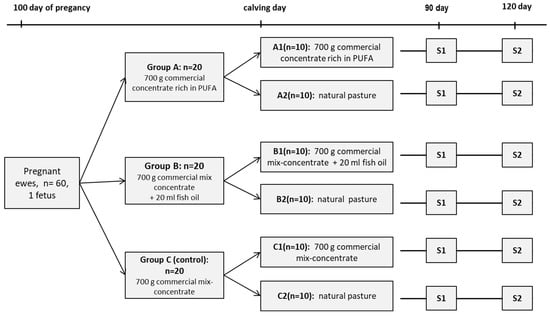 Experimental protocol. n-3 polyunsaturated fatty acids (n-3 PUFA). Group A: fed with 700 g of a diet rich in PUFA before birth; Group B: fed with 700 g of the commercial mix-concentrate together with 20 mL of Vita-Mega3® before birth; Group C: fed with 700 g of the commercial mix-concentrate; Group A1, B1 and C1: fed after birth the same as the prepartum; Group A2, B2 and C2: fed only on natural pasture during the same time period. S-1: sample 1 at 90 days; S-2: sample 2 at 120 days.