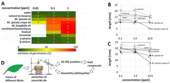 Response of cress seedlings to essential oils from different mints and of compounds found in these oils administered through the gas phase. (A) Inhibition of germination rate; mean values from five independent replications collected in two different laboratories with 100–297 individuals scored for each experiment. White fields have not been determined. (B,C) Modulation of seedling growth for hypocotyl (B) or root (C). Data show mean and SE over those seedlings that had germinated. Letters indicate groups that are different with respect to the Least Significant Difference (LSD) test for a significance threshold of p < 0.05. (D) Experimental design of the study.
