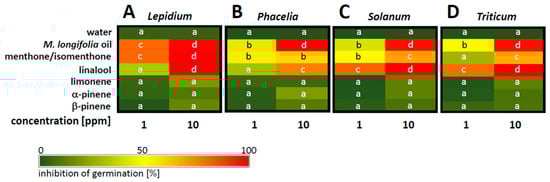 Species spectrum of sensitivity to essential oil from M. longifolia and of compounds found therein administered through the gas phase. Inhibition of germination rate; mean values from three independent replications with 100 individuals scored for each experiment. Responses are shown for Lepidium sativum (A), Phacelia tanacetifolia (B), Solanum Lycopersicon (C), and Triticum aestivum (D). Letters indicate groups that are different with respect to the Least Significant Difference (LSD) test for a significance threshold of p < 0.05.