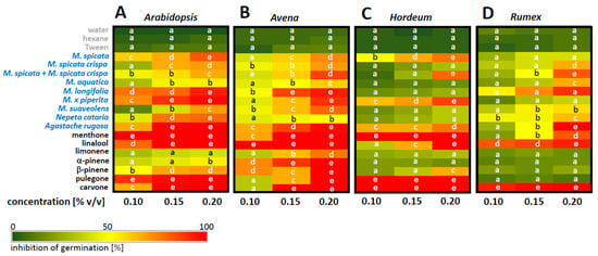 Species spectrum of sensitivity to essential oils from different mints and of compounds found therein administered through the liquid phase. Inhibition of germination rate; mean values from three independent replications with 30 individuals scored for each experiment. Responses are shown for Arabidopsis thaliana (A), Avena sativa (B), Hordeum vulgare (C), and Rumex acetosella (D). Solvent controls involve 0.15% hexane (as solvent for the pure compounds), 1% v/v Tween 20 (as solvent for the essential oils, blue), or water. Letters indicate groups that are different with respect to the Least Significant Difference (LSD) test for a significance threshold of p < 0.05.