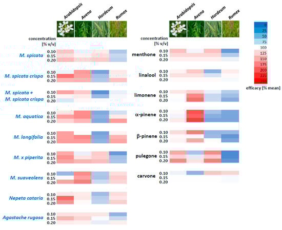 Using this approach, one sees that, for instance, Arabidopsis is especially sensitive to essential oils from M. spicata crispa, M. longifolia, M. x piperita, and Nepeta cataria when compared to the other species, while Avena is also sensitive to M. suaveolens. Hordeum, which is generally quite robust, shows sensitivity to M. spicata and M. x piperita, but is not sensitive to M. longifolia, which, instead, can be used to address Rumex. With the individual compounds, the sensitivity of Avena to α-pinene, limonene, and β-pinene is noteworthy, while pulegone is of little effect, but shows good activity against Arabidopsis and Hordeum. Rumex can be tackled by carvone and also, to some extent, by linalool, which does not affect Hordeum.