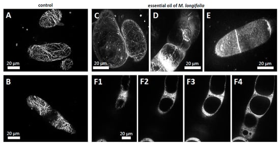 To obtain insight into the mode of action of horsemint oil, we probed for the response of the cytoskeleton. Microtubules are not only essential for cell division driving the development of meristems in germinating seedlings, but also sustain cell axis in elongating tissues such as the distal elongation zone of the root or the hypocotyl. Actin filaments are not only essential for the elongation of root hairs, but also support the polar flow of auxin through the plant. Therefore, we exposed tobacco BY-2 cells expressing GFP-tagged markers for actin filaments and microtubules [,] to horsemint oil acting through the gas phase as described in [] and followed the responses using spinning disc confocal microscopy. While in cells exposed to the solvent control, n-hexane, the actin filaments displayed a well-developed network (Figure 6A,B) and the essential oil of M. longifolia caused the almost complete breakdown of the actin cytoskeleton (Figure 6C–E). The filaments were reduced to very short rod-like structures along with a soluble signal that often accumulates along the cross-walls (Figure 6D–E). In confocal z-stacks (Figure 6(F1–F4)), individual fluorescent punctae could be discerned on the surface of the vacuole, probably representing actin nucleation centres.