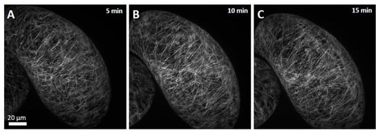 Effect of essential oil from M. longifolia on microtubules in tobacco BY-2 cells visualised by the marker NtTuA3-GFP and spinning disc confocal microscopy. Time course of a cell after 10 min (A), 20 min (B), and 30 min (C) of treatment with essential oil of M. longifolia (0.1% v/v).