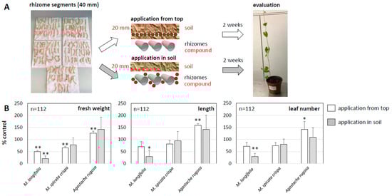 Effect from mint oil formulations on the development of regenerating rhizome sections of Convolvulus arvensis. (A) Design of the experiment: 50 µL of essential oils from three different mints were formulated in 2 g of a slow-release carrier corresponding to 2.5% v/v and either placed on top of the rhizomes or worked into the soil where the rhizomes were cultivated. (B) Quantification of the effect after 2 weeks of treatment, measuring shoot fresh weight, shoot length, and number of leaves. Data points represent mean values and SE from two independent experimental series with nine individuals per data point and replication. Significant differences from the control are indicated by * (p < 0.05) and ** (p < 0.01).
