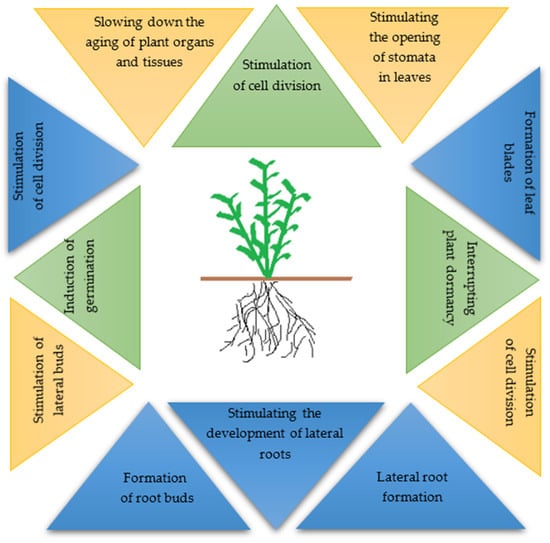 In a plant, there are about five key growth hormones that interact with each other: auxins, cytokinins, gibberellins, ethylene, and abscisic acid. They are effective if the relationship between them is balanced, but any imbalance affects the action of one of the hormones, triggering or deactivating another. Auxins are the most important because they are involved in all plant physiological processes. They form root buds, participate in cell division, and take part in tropisms. Cytokinins affect cell division, which in turn affects plant growth, but they also stimulate lateral buds and inhibit the aging of organs and plant tissues. In turn, gibberellins induce germination, interrupt plant dormancy, and stimulate cell division [,,,,,]. Ethylene and abscisic acid have the opposite effect to the three above-mentioned groups. They inhibit the growth and development of plants and accelerate their senescence. When the plant is under stress, the activity of abscisic acid increases, which is why it is called a stress hormone [,,]. Hormones commonly found in plants primarily include auxins and cytokinins, whose role seems to be crucial in plant growth and development [,,,,,,,,].