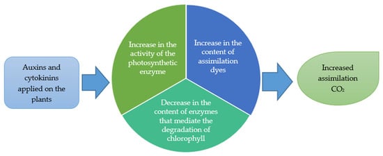 Plant productivity depends, to a large extent, on the content of photosynthetic pigments, which is the most important factor affecting photosynthesis (Figure 2). Some studies report that the content of total chlorophyll and carotenoids increased in plants sprayed with indole-3-butyric acid. Aldesuqe [] applied indole-3-acetic acid (IAA), belonging to the auxin class, at a concentration of 25 mg kg−1, to wheat and noted a significant increase in total chlorophyll content. Using a slightly lower concentration of IAA (10 mg L−1), Galdallah [] reported a clear increase in chlorophyll content of soybean leaves. In contrast, Pandey et al. [] and Skalska [] applied BAP to alfalfa at various concentrations, from 0.025 to 0.20%, and found a significant increase in chlorophyll a content, while spraying these plants with IAA did not affect it. Fu et al. [] report that as soybean plants age, the chlorophyll content of carotenoids decreases. Exogenously applied cytokinin may increase chlorophyll content in aging leaf tissues by slowing the breakdown of this pigment and by delaying the senescence process []. In their research on the effect of BAP on cabbage, Costa et al. [] observed a slower degradation rate of total chlorophyll compared to control plants. At the same time, the authors determined the activity of enzymes mediating chlorophyll degradation, such as chlorophyllase and magnesium dechelatase. It turns out that in plants sprayed with BAP, there is a significant decrease in the activity of these enzymes compared to control plants.