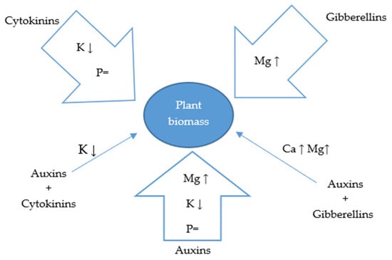 Exogenously used auxin and cytokinin do not affect plant phosphorus content. This tendency was confirmed by the results obtained by Czapla et al. [] and Nowak et al. [], who found no change in its concentration in field bean, soybean, and lupine after the use of synthetic auxins and cytokinins. However, the literature [,] suggests that an increase in the content of certain minerals in the aboveground parts of plants in response to synthetic growth hormones occurs because of a better developed root system, in particular, because of the elongation of capillary roots. As a consequence, this leads to more intensive nutrient uptake from soil. Zhao [] and Weijers et al. [] report that auxins are the most effective here, sending signals informing about the course of physiological processes in acceptor organs of photosynthesis products and about increasing demand for nutrients. In addition, cytokinins together with auxins stimulate cambium activity and the formation of vascular tissues that facilitate the penetration of various types of nutrients in plants [].
