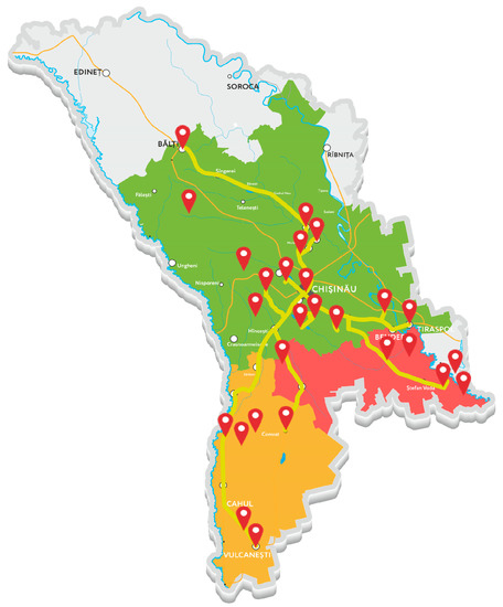 Map of wineries in Republic of Moldova. Sources: https://wineofmoldova.com/en/ (accessed on 16 March 2023).