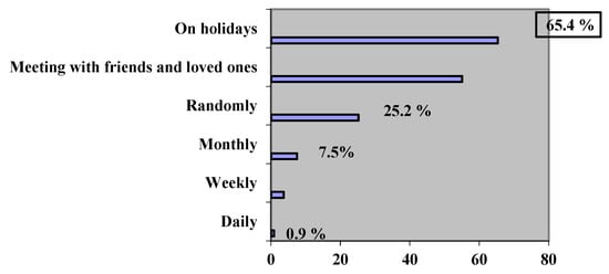 Analyzing the answer to the 13th question regarding the frequency of consumption of wine products, we recall the tradition of rural natives to grow vines and produce wine for personal consumption with family and friends. From 106 answers obtained, it was found that wine products are consumed daily by 1 person or 0.9%, weekly by 4 persons or 3.8%, monthly by 8 persons or 7.5%, on holidays (religious, national, family) by 70 persons or 66%, when meeting with friends and loved ones by 59 persons or 55.7%, and randomly (only when I want to consume wine products) by 26 persons or 24.5%. The exposed results can be seen in Figure 4.