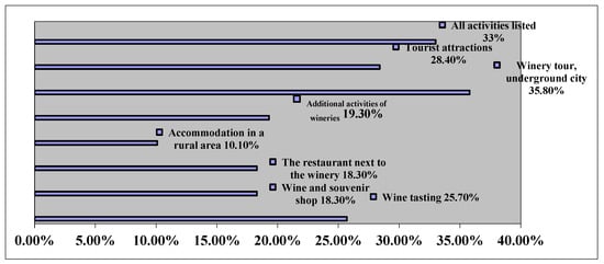 - The purpose of the visit to the wineries for the surveyed respondents to a greater or lesser extent was to visit wineries, underground cities, uniquely designed rooms, tasting some wine products, purchasing wines and souvenirs, having a meal at the restaurant next to the winery, staying in rural space, additional activities offered by the wineries (boating, cycling, swimming pool, sauna, etc.), for the tourist attractions in the area, etc.