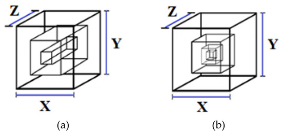 In the next step, aiming at the study of the representative elementary volume (REV), the images were cropped again using two different approaches: (1) concentric core—A fixed axis (z = soil depth) was defined and the subvolumes were selected concentric from this axis (Figure 2a), and (2) concentric cubes—A cubic subvolume was selected at the center of the ROI and increasingly larger cubes were selected from the smallest selected to the entire volume of interest (VOI) (Figure 2b). Finally, the crops resulting from all subvolumes were carried out with the REVaux software, developed especially for this study. With the help of this program, we determined the number of sections cropped, defined their sizes in 3D, and used the central section as a reference.