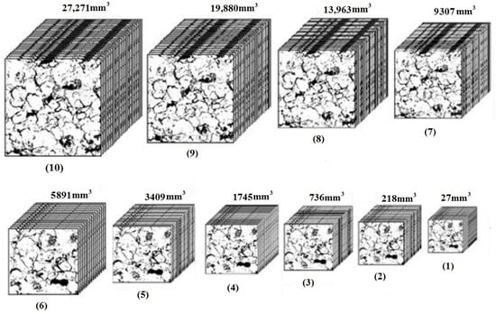 Schematic drawing of the subvolumes selected for the analysis of the representative elementary volume (REV) (concentric cube scheme). The information above and below the images indicates the size and number of the subvolumes analyzed, respectively.
