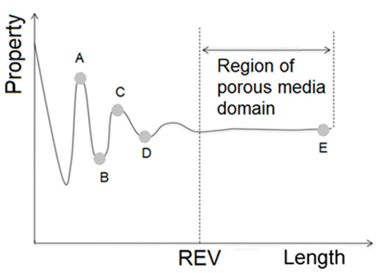 Figure 4 illustrates the REV definition considering the regions of the microscopic inhomogeneity domain (left of the dotted line) and the region of the porous medium domain (right of the dotted line). The dotted line indicates the smallest window length (REV) over which a representative measurement can be made. Figure 5 shows the flowchart of the main steps performed during this study.