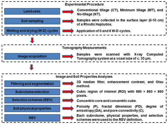 Thus, this study is based on three hypotheses: (1) REV is affected by different land uses, (2) REV is influenced by processes occurring in the soil, such as W-D cycles, and (3) different selection schemes (cubes or cores) affect REV definition. High-resolution XCT images were employed to verify these hypotheses. The contrasting land uses studied were conventional tillage, no-tillage, and minimum tillage. Soil samples were also submitted to 0 and 6 W-D cycles. However, as described before, our study focuses primarily on REV estimation aiming at measuring geometrical and morphological properties through XCT.
