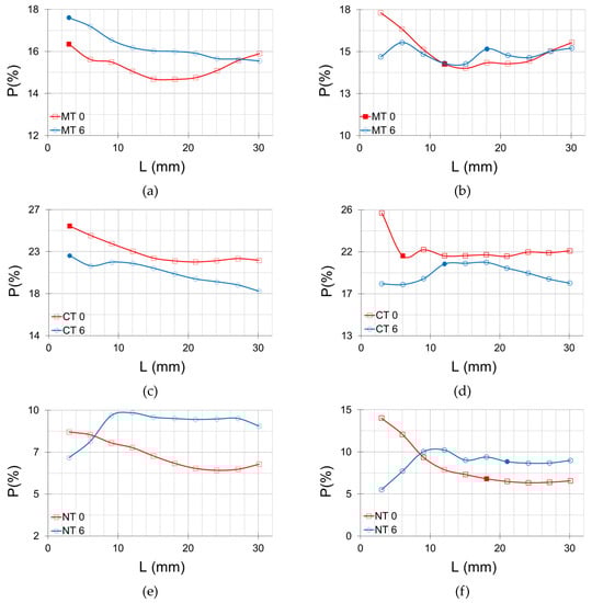 The results of the average imaged porosity showed the subvolume selection scheme (core or cube) influence in the REV determination (Figure 6). We also observed that REV was affected when the soil was submitted to contrasting land use systems and wetting and drying cycles. No clear trend was observed among REVs when the different methods of subvolume selection were employed for P. In the core method, samples submitted to 0 and 6 W-D cycles reached the REV for MT and CT for the same window length (L = 3.0 mm) (Figure 6a,c). For NT (Figure 6e), estimating REV was impossible. In the cube method, we observed that REV could be calculated for all land uses. The application of W-D cycles requires larger window length images in the REV estimation. For MT (Figure 6b), REV was estimated at 12.0 mm (0 W-D) and 18.1 mm (6 W-D). For CT (Figure 6d), REV was reached at 6.0 mm (0 W-D) and 12.0 mm (6 W-D), whereas for NT (Figure 6f), the values found were 18.1 mm (0 W-D) and 21.0 mm (6 W-D). Such a result obtained using the cube method shows that the porosity was sensitive to the chosen land use and the application of W-D cycles.