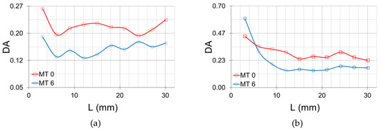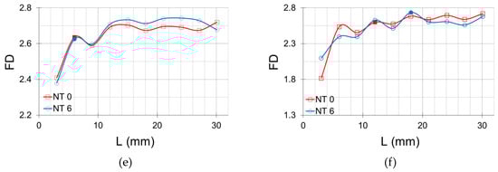 The average fractal dimension, calculated through the box-counting method, was employed to characterize the complexity of the soil pore system. The core method presented lower REV values among the land use systems and W-D cycles when compared to the cube method (Figure 7). Similar to P results, the soil land use showed differences in the REV estimation only in the cube method (except for NT in the porosity case—core method). Using the core method, MT presented the same REV for 0 and 6 W-D (L = 6.0 mm), indicating that for this land use system, the wetting and drying cycles did not influence the REV estimation (Figure 7a). For CT (Figure 7c) and NT (Figure 7e), similar to the results of MT, REV was not affected by the cycles (L = 6.0 mm—0 and 6 W-D). In the cube method, the W-D cycles did not affect the REV definition for MT (L = 18.1 mm) (Figure 7b). However, for CT (Figure 7d) and NT (Figure 7f), the application of the W-D cycles increased the window length needed for the REV estimation. These results follow the same trend as observed for P (Figure 6d,f). For CT, REV increased with the application of W-D cycles from 6.0 mm (0 W-D) to 18.1 mm (6 W-D), while for NT, it moved from 12.0 mm (0 W-D) to 18.1 mm (6 W-D). Interestingly, applying the cycles caused the REV to be achieved for the same length window for all land uses in the core method.