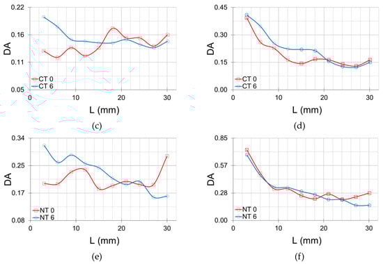Average degree of anisotropy (DA) as a function of the different window length-scales (L) obtained based on the microtomographic images. (a) Minimum tillage (MT) and core method, (b) MT and cube method, (c) Conventional tillage (CT) and core method, (d) CT and cube method, (e) No-tillage (NT) and core method, and (f) NT and cube method. The soil samples were submitted to 0 (red lines) and 6 (blue lines) wetting and drying (W-D) cycles. The marker (full) indicates the representative elementary volume (REV) estimated for each land use and W-D cycle.