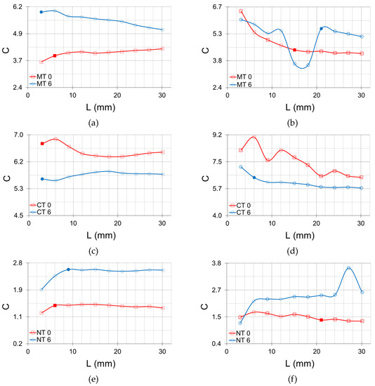Average pore connectivity (C) as a function of the different window length-scales (L) obtained based on the microtomographic images. (a) Minimum tillage (MT) and core method, (b) MT and cube method, (c) Conventional tillage (CT) and core method, (d) CT and cube method, (e) No-tillage (NT) and core method, and (f) NT and cube method. The soil samples were submitted to 0 (red lines) and 6 (blue lines) wetting and drying (W-D) cycles. The marker (full) indicates the representative elementary volume (REV) estimated for each land use and W-D cycle.