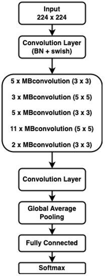 EfficientNetB3 belongs to the EfficientNet family [33], ranges from B0 to B7, and is regarded as one of the most computationally efficient DL models developed using ImageNet [34]. EfficientNet is a CNN architecture and scaling technique that uses a compound coefficient to consistently scale all depth, width, and resolution dimensions [33]. Furthermore, the scaling method evenly scales network width, depth, and resolution using a set of immovable scaling coefficients, in contrast to standard practice, which scales these variables arbitrarily [33]. In CNN, the kernel is a filter which is utilized to retrieve attributes from images [35], while convolution is utilized to construct a feature map. The model architecture of EfficientNetB3 consists of a convolution layer of kernel size (3 × 3) with BN and swish activation followed by 26 MBconvolution blocks. The MBconvolution blocks are varied with kernel sizes of (3 × 3) and (5 × 5), as shown in Figure 1. The last block of MBconvo is followed by a convolution layer. Global average pooling is utilized at the end of the convolution layers for dimensionality reduction of the feature maps. Fully connected (FC) and softmax are used at the end of the model architecture to generate the output.