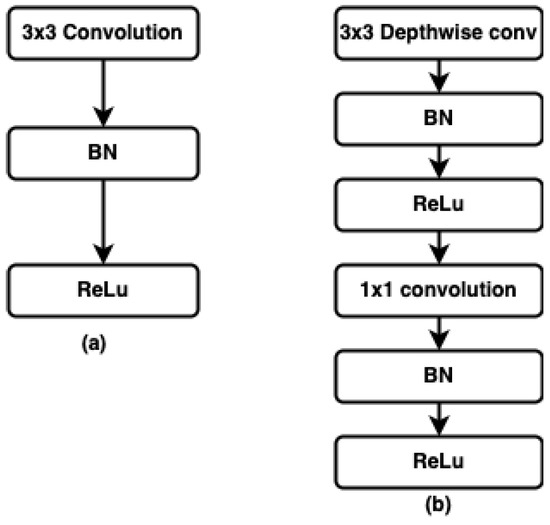 MobileNet, a CNN-based model developed by [36], has a simplified architecture that builds lightweight deep convolutional neural networks using depth-wise separable convolutions. In the model architecture described by [36], MobileNet factorizes standard convolutions into a depth-wise convolution and a (1 × 1) pointwise convolution, as shown in Figure 2. A single convolution on every channel is performed using depth-wise filters, while the output of a depth-wise convolution is combined with the (1 × 1) pointwise convolution [37]. Due to factorization, the computation and model sizes significantly decrease, which eventually enhances the performance of the model. ReLu activation is used between the layers in order to flatten the nonlinear outputs of the preceding layer and provide it to the succeeding layer as input [12].