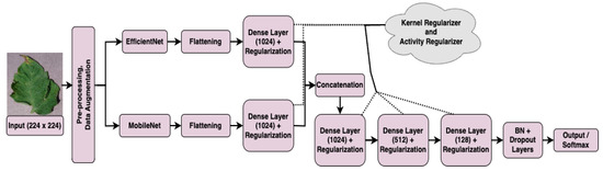 A hybrid model can be used to improve predictive performance by running two or more relevant but distinct models and combining the results into a single score [38]. The literature review revealed that tomato leaf diseases were mostly detected and classified using individual DL models such as EfficientNet, MobileNet, and others, or a hybrid of ML and DL models. This study proposes EffiMob-Net, a hybrid DL model for detecting tomato leaf diseases that is a combination of two individual pretrained DL models, EfficientNet and MobileNet (see Table S1 in Supplementary Materials). A total of 10 diseases related to tomato leaves are recognized and classified using the hybrid EffiMob-Net. According to [39], accurate classification can be achieved by fusing diverse models with different hypotheses concerning class labels, which may not be viable with separate models. Using this approach, we took advantage of the standard architectures of both DL models in which the formerly trained weights of both DL models were loaded for the feature extraction of leaf images and combined for detection purposes, as shown in Figure 3.