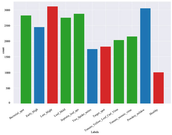 The proposed hybrid EffiMob-Net model was trained using an openly available dataset gathered from multiple sources, mostly from a plant village database [41] containing a total of 11 classes. Among the 11 classes, one was healthy and the remaining 10 represented different diseases of tomato leaf. The dataset consisted of a total of 32,535 images acquired from a plant village dataset and some collected images distributed into two separate folders: training and validation sets. In this study, the whole validation set is utilized for testing purposes; therefore, the validation set is changed to the test set shown in Figure 3. Thus far, this is the largest publicly available dataset of tomato leaf diseases. The training set contained 25,851 images; 6684 images were part of the test set. The images in both sets were distributed to 11 classes as described in Figure 4 Figure 5shows the number of images per class in the training set. Figure 6 shows sample images in the training set. The dataset is suitable for building a DL model that can predict a particular disease of a tomato leaf and classify them accordingly.