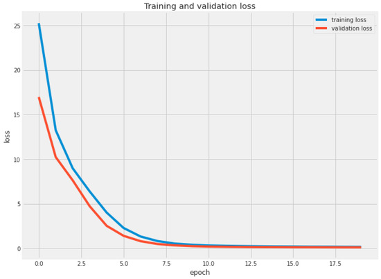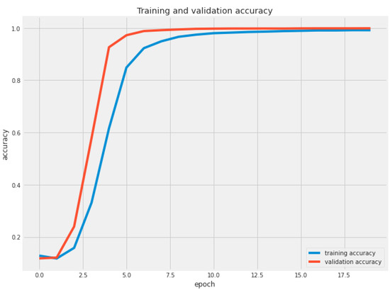 The dataset used in this study was split into two separate sets: training and testing at a ratio of 80% to 20%, respectively. According to [46], experimental research indicates that using 20–30% of the data for testing and the remaining 70–80% of the data for training yields optimal results. In this study, 80:20 achieved optimal results and was thus chosen for data splitting. The training set was utilized to train the hybrid EffiMob-Net model on a Google Colab in a GPU environment using Python programming language. The testing set was used to validate the model performance. The experiment was executed using MacBook Pro for 20 iterations in 40 batches. The model was compiled using the Adamax optimizer with a learning rate of 0.001. The best classifier with respect to accuracy metrics was selected to show the results for detecting tomato leaf diseases. The 20% testing set was used to verify the performance of the hybrid EffiMob-Net model using training and validation accuracies and losses. Categorical cross-entropy was used as a loss function to measure the losses. The experiment was repeated several times, and the best-fitting model with respect to accuracy metrics was finalized. The finalized trained hybrid model was then saved to the local directory for future use. Figure 7 depicts the training and validation accuracies. Normally, the curve of training accuracy is greater; however, both curves come closer to each other as the epochs advance. An epoch represents one iteration of training a model with all training data. The best epoch in which both curves coincide is epoch 20, which was one of the main reasons for executing the model for 20 epochs. Likewise, the training and validation loss shown in Figure 8 demonstrates the validity of the proposed hybrid EffiMob-Net in that both curves come closer to each other, progress simultaneously as the epochs advance, then coincide at epoch 13 and progress together in the same manner. This indicates the lack of overfitting of the hybrid EffiMob-Net model, which was avoided by using regularization, dropout, and BN techniques. The performance of the model was measured using accuracy, precision, recall, and F1-scores from the following equations.