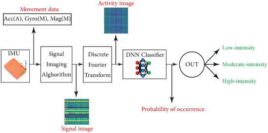 Apart from the reviewed literature that focused on the training of classical machine learning algorithms using handcrafted features of data, a recent body of literature has studied the autonomous feature learning capabilities of Deep Learning (DL) technology. This paradigm has received particular attention in the field of human activity recognition (see [30] for a recent review). The efficacy of the methods in this scheme has further been enhanced by the rapid advancements in the hardware (i.e., lightweight sensors for large data acquisition, and powerful processors for deep networks training), and software (advanced framework for optimization and parallel computations). Motivated by the outstanding performance of DL models in image classification and object detection, a number of studies have investigated the possibility of encoding IMU signals into a form of images that can readily be recognized by the well-known DL-based models [19,21,31,32,33,34]. This encoding technique is sometimes referred to as the signal imaging.