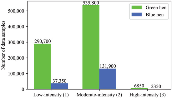 To distinguish the hens from each other, two distinct colors are used for the backpacks, namely green and blue. Accordingly, we shall refer to the subjects as blue hen and green hen, as shown in Figure 2. The green hen data includes 2 h and 20 min of wearable sensor log at a rate of 1000 Hz, whereas the blue hen data includes only 29 min at the same sampling rate. For the sake of labeling, video recording was also performed and synced by the movement signals. An in-house expert has carefully processed recorded sequences frame by frame and labeled the data accordingly. As outlined earlier, only three super classes are considered for labeling, which include different types of low-, moderate-, and high-intensity activities listed in Table 2. The distribution of data among the three classes is shown in Figure 3. Note that the dataset is imbalanced, since the high-intensity (Class 3) samples are much fewer than the other two classes. Additionally, the green hen dataset is considerably larger than the blue one.