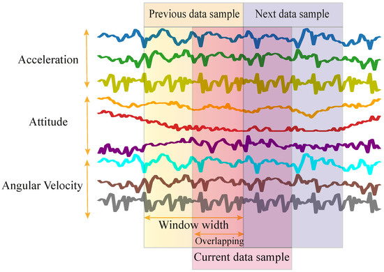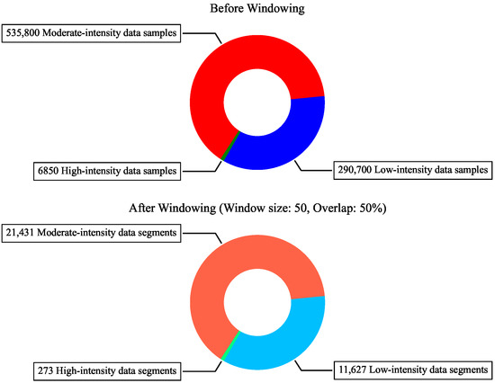 A form of sampling is usually needed for time-series signals to be digested by DNNs. This is mainly because the durations of different activities, embodied through special patterns in the signals, are substantially different, while DNNs prefer to receive constant-size inputs. As such, a time windowing technique is applied in which a sliding window of a specific size spans the signals, yielding sampled (segmented) pieces of data. As illustrated in Figure 4, an overlap can be considered between every two adjacent segments to ensure a smooth transition. Unless otherwise specified, a sliding window of 50 data samples and 50% overlap are considered in this study. Figure 5 shows how this windowing technique affects the size of data for the green hen. It is easy to show that letting x be the number of samples in a class, the number of data segments after windowing will be . The width of DNN inputs is determined by the windowing size.