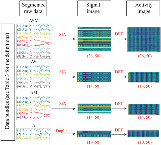 Generation of signal and activity images from the segmented raw data for different data bundles. The channels of the segmented signals are stacked in the signal images row-by-row in the following orders: “123456789135792468147158259369483726” for AVM data bundle, “12345613514624” for AV and AM data bundles, and “1231231” for the A data bundle. Please refer to Table 3 for the definition of the data bundles. SIA and DFT stand for Signal Imaging Algorithm and Discrete Fourier Transform, respectively.