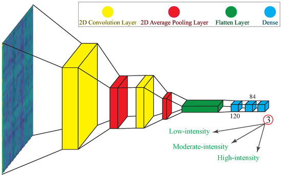The LeNet5 architecture with modified input and layer sizes is illustrated in Figure 7 for the AVM data bundle (see Table 3). The network accepts the activity images as input and gives the probability of occurrence of the three behavior classes as output. The activity images are normalized in the interval before feeding to the network. The first two pairs of layers apply convolution and average pooling sequentially, extracting deep features of the images such as key patterns. A flatten layer then vectorizes the feature map, making it ready for densification by three consecutive fully-connected layers, which output the probabilities of each class occurrence. Table 4 reports the number and size of filters as well as the respective activation functions in each layer when applicable. Additionally, the obtained shapes of feature maps in each layer for different data bundles are given in Table 5.