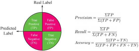 To illustrate the classification performance, we evaluate commonly used performance metrics illustrated in Figure 8. A true positive (TP) is an outcome where the model correctly predicts the true class. Similarly, a true negative (TN) is an outcome where the model correctly predicts the false class. A false positive (FP) is for the case where the model incorrectly predicts the true class, and a false negative (FN) means the model incorrectly predicts the false class. Accuracy describes the general performance across all classes. It is the ratio of the number of correct predictions to the total number of predictions. Recall calculates the model’s capability to detect the true samples, i.e., it computes the ratio of true samples correctly classified as true to the total number of true samples. Finally, precision measures the ratio between the number of correctly classified true samples to the total number of true classified samples. These performance metrics can take values in the range by definition.