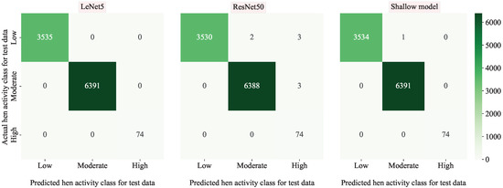 In order to illustrate the best performance achievable by the proposed framework, we train the three introduced models on the green hen activity images of the AVM data bundle, which includes its full-feature dataset. The training process for all models went smoothly, as shown in Figure 9, where the accuracy and loss during training are plotted. All accuracies converged to 1 while the corresponding training losses were ever decreasing. As for testing, Table 6 reports the evaluation of performance indices presented earlier on the test set of the green hen. Additionally, the confusion matrices for all the three models are shown in Figure 10.