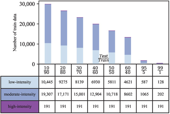 Figure 11 illustrates the distribution of green hen data when different test-to-train ratios are considered. The numbers provided underneath the plot are the sample counts for each subclass used for training. Note that the amount of data used for the high-intensity class is kept constant, because it is already small. In Figure 12a,b, we plot the test accuracy and loss versus different test-to-train ratios for different data bundles. Overall, the model demonstrates satisfactory performance even when extremely small datasets are used for training. Subtle drops in accuracy are seen when the ratio is smaller than 20/80, where the testset size is small, and the model tends to overfit as such. One can see the best performance when the ratio is around 30/70, as expected. As for the different data bundles used for training, no major differences are seen in the results for the small and medium test-to-train ratios. However, we will have more to say about this in the following analysis where we consider noisy data.