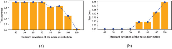 The effect of corrupting the green hen AVM data bundle by Gaussian noises of different levels on the test accuracy (a) and loss (b). The recognition model uses the LeNet5 architecture.