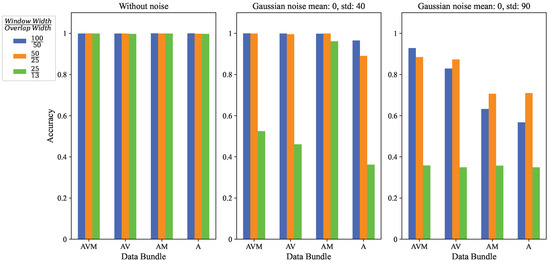 First, the considered variations on the data bundle and window width do not present remarkable effects on the performance when uncorrupted data are used for training. Second, when noisy data are involved, however, the performance starts to degrade. In this case, the effect of window size is revealed earlier even with the mid-level noises (middle panel of Figure 14), while the difference between different data bundles remains subtle until high-level noises are considered, as in the right panel of the figure. Third, irrespective of the window width, the noise corruption shows stronger effects on poorer data bundles. This can be seen when comparing the accuracies of the AVM and A data bundles in the right panel of Figure 14. Additionally, notice in the same figure that the AV data bundle performs better than the AM data bundle, suggesting that the angular velocity data may be more useful (i.e., discriminative) than the magnetic field data in the performed experiment and analysis. Finally, when it comes to comparing the performance of models with different window widths, it looks as though there is an optimum value, as can be seen in the right panel of Figure 14. Small window widths result in poor performance because the noise affects the 2D patterns of the data more severely in this case. On the other hand, large window widths are also not desirable, most likely because in this case the number of data segments, i.e., activity images, becomes small and the network cannot train satisfactorily on the small dataset.