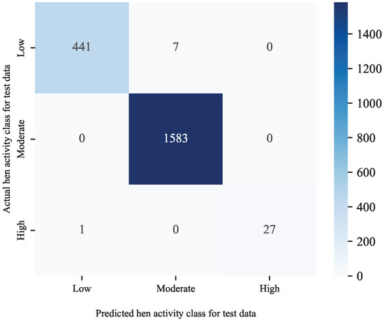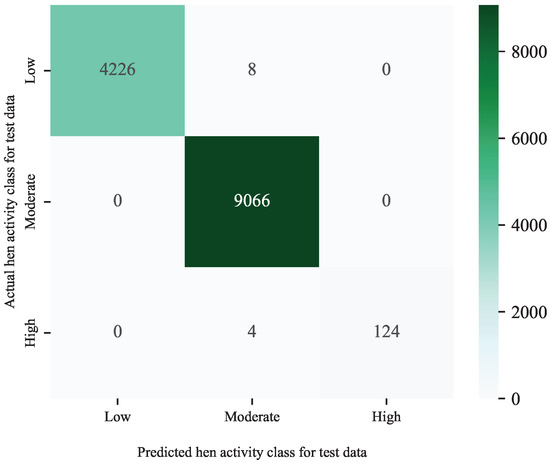 Lastly, we would like to study how well the developed algorithms and models are applied to a different subject. To do so, we first train a fresh model on the blue hen dataset following the similar steps taken for the green hen. The results are very similar to what were achieved for the green hen. Table 7 reports the evaluation of different performance indices considered in this study. Additionally, Figure 15 shows the corresponding confusion matrix, indicating the success of the model in predicting the correct class, even for the high-intensity activities for which only a few instances were present. Overall, this experiment corroborates the repeatability of the presented approach on a new subject.
