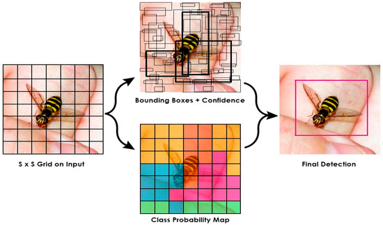 The YOLO algorithms divide the image into N grids [30], with an equal-sized S × S region in each grid. Each of these N grids is responsible for discovering and locating the object it contains, as seen in Figure 2.